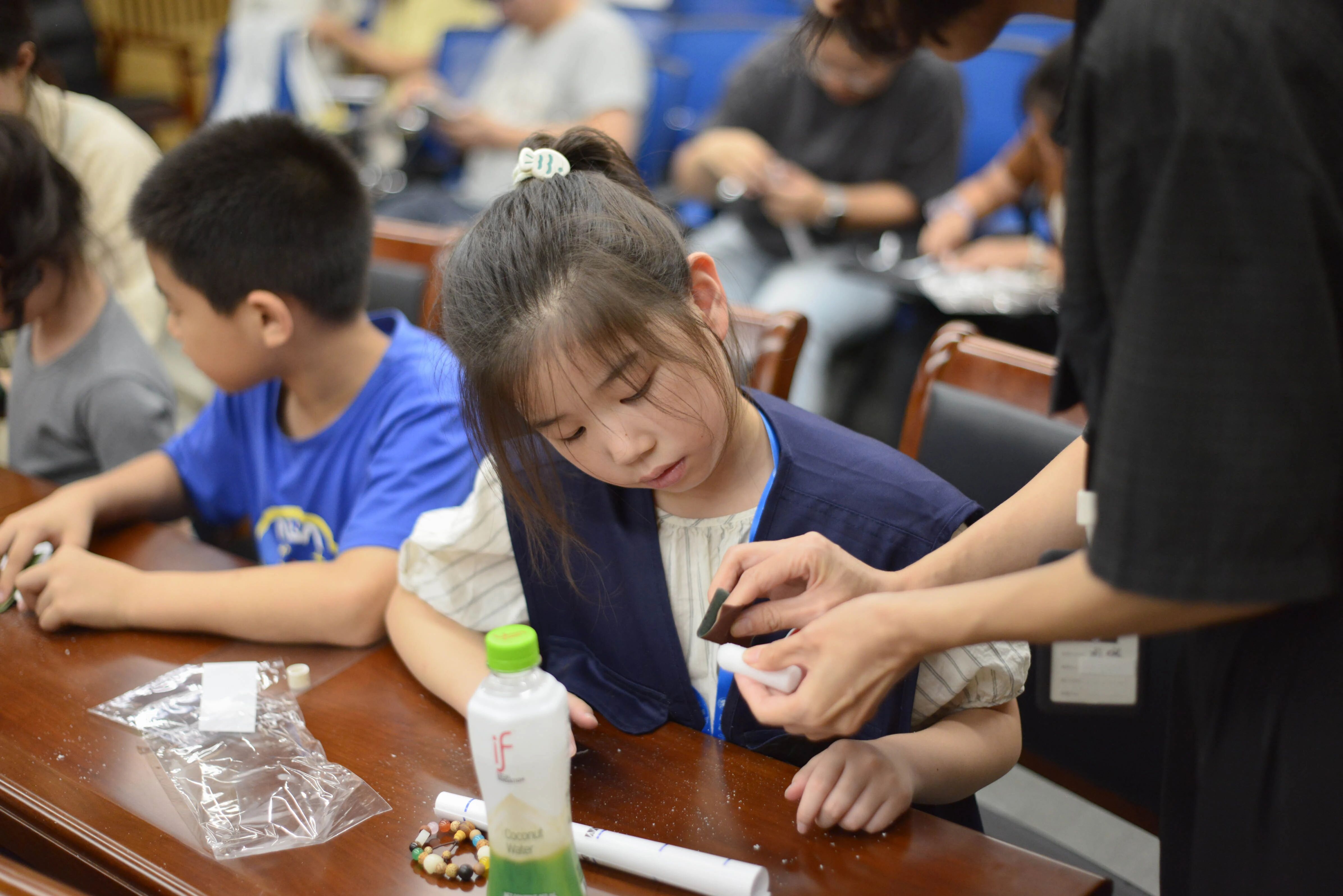 DIY火箭制作环节将现场气氛推向高潮。孩子们在吴老师和馆员的指导下,仔细拼装箭体、安装尾翼、调整重心,一步步将零件组装成属于自己的火箭模型。专注的表情、默契的协作,让整个活动现场充满了创造的喜悦。