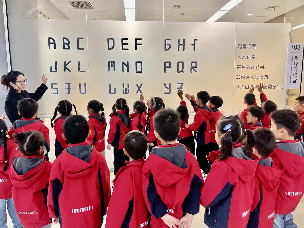 活动伊始,馆员用生动有趣的语言介绍了图书馆作为“知识宝库”的功能与意义。在馆员的引导下,大家有序参观了公共文化中心一楼中庭展览,随后走进自助借还机区域、幼儿借阅室、青少年借阅室和视障阅读室等区域。在视障阅读室,盲文书籍格外引人注目。孩子们围在书架旁,小心翼翼地伸出小手,轻轻触摸着书上凸起的点字,感受着这种独特的“文字”,脸上写满了惊奇与思考。