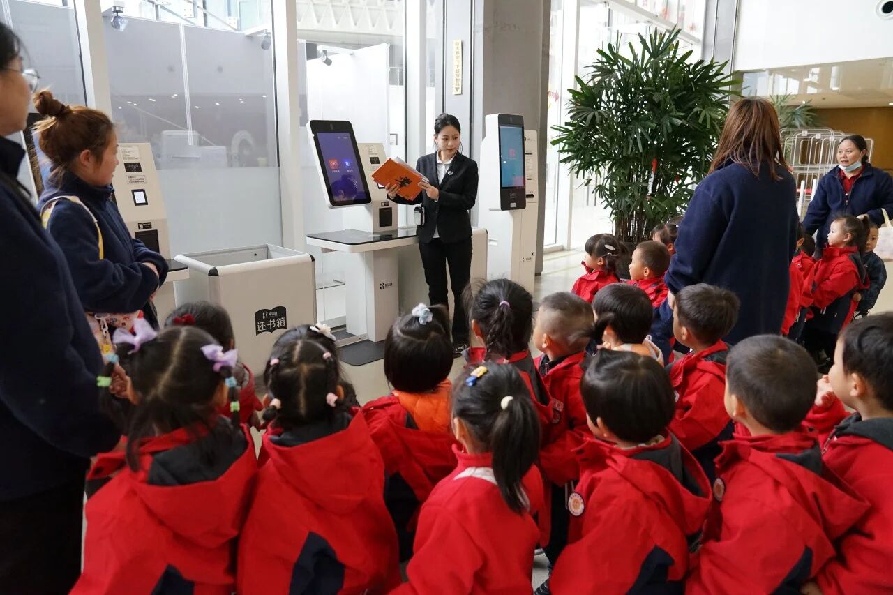 在图书馆功能探秘环节,馆员带领大家参观了馆内的各个功能区域,介绍了自助借还机的使用方法以及不同借阅室的特点。小朋友们认真聆听,对图书馆有了更直观的认识。