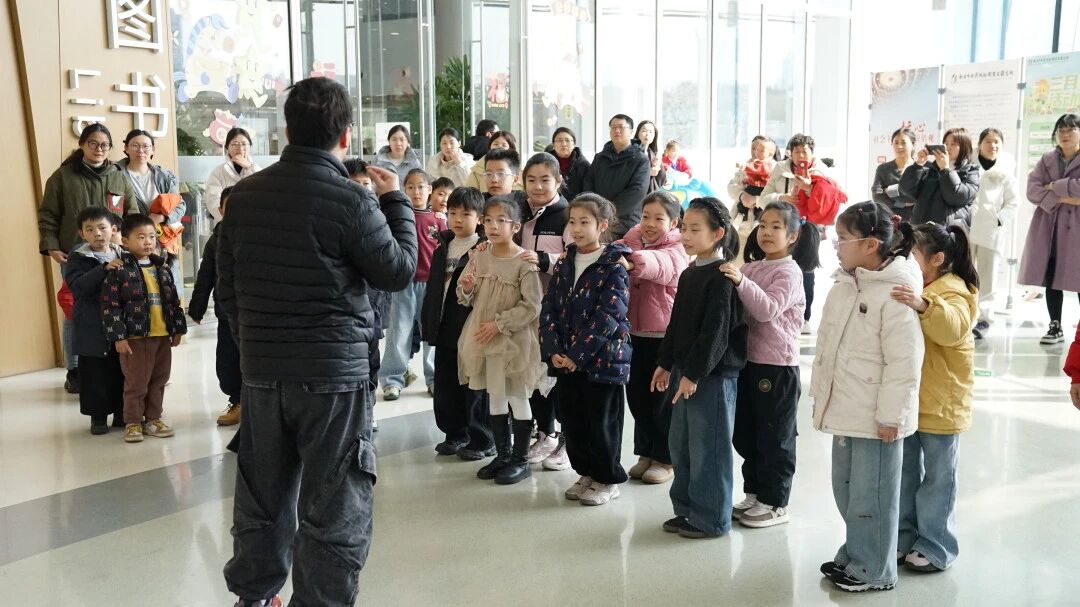 活动伊始,朱亮老师以一场别出心裁的“贪吃蛇”热身游戏瞬间点燃了现场气氛。在朱老师的带领下,小读者们排成一列长队,化身灵动的“小蛇”穿梭前行。有趣的互动环节中,大家紧紧跟随、亲密无间,就像一个个红彤彤的山楂被串在了一起,化作了一串灵动俏皮的“人形糖葫芦”。这一充满童趣的设计不仅迅速拉近了小读者们的距离,更巧妙地扣住了活动主题,现场笑声连连。