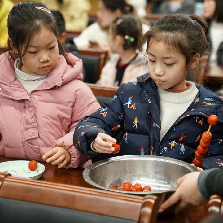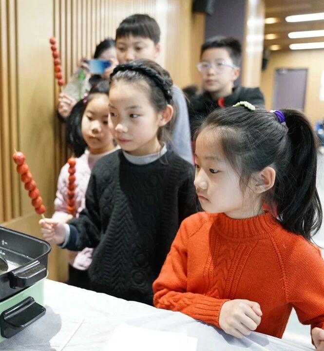 随后,令人期待的DIY环节正式开始。桌上整齐摆放着红彤彤的山楂和竹签。在朱老师的示范指导下,小读者们迫不及待地将山楂串起,这不仅是在竹签上串起了美味,更串起了春日的童趣。最关键的“蘸糖”环节,朱老师耐心地帮小读者们将山楂串在滚热的糖浆里旋转,均匀裹上一层晶莹剔透的糖衣,并细心地为其裹上糯米纸。看着一串串色泽鲜艳、软糯香甜的冰糖葫芦大功告成,孩子们的眼中闪烁着兴奋的光芒。